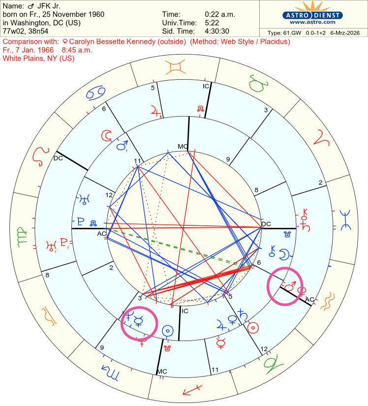 I also have to mention, given how they both died, I find it very peculiar that his Mercury-Neptune conjunction in Scorpio lands in Carolyn’s 9th house of long distance travel…